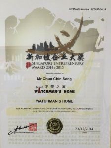 The Founder of the Watchman’s Home, Mr Chua Chin Seng, was awarded “Singapore Entrepreneurs Award 2014/ 2015” in Dec 2014, for:
